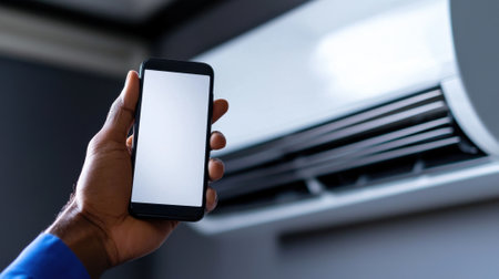 A person holds a smartphone in one hand, showcasing a blank screen, while standing near a wall-mounted air conditioning unit in a cozy indoor setting.