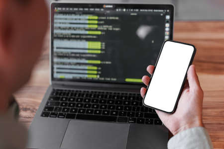 Female scanning fingerprint on her smartphone with program script on laptop display on backround. Woman unlock mobile phone with biometric sensor and finger. Privacy and security concept.