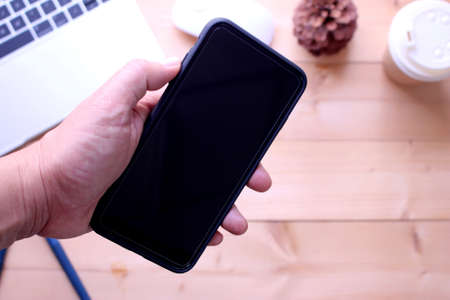 business man holding smartphone on office table desk background