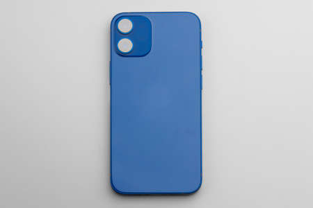 Blue modern smartphone with double-lens camera on gray background