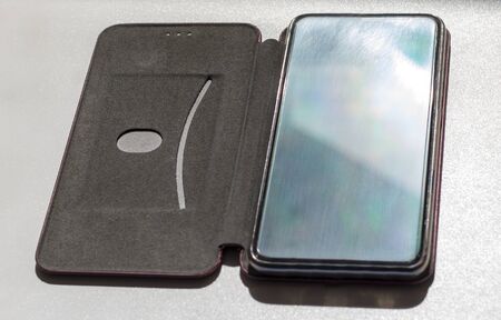 Smartphone with leather case cover on white background.