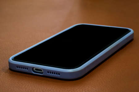 Mobile phone with black screen on brown leather with rough texture background