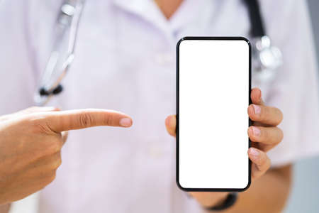 Doctor showing white empty smartphone screen, mock-up