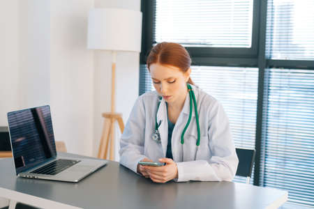 Portrait of attractive redhead female doctor in white coat giving fast remote diagnose the patients using mobile phone, sitting at desk with laptop near window in sunny day.