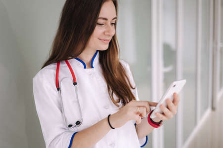 Portrait of youg female doctor using phone during break in clicic