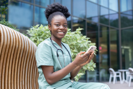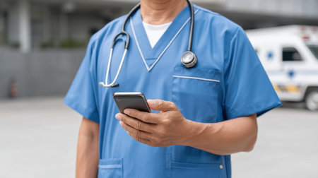 A healthcare professional in blue scrubs uses a smartphone outdoors, showcasing the integration of technology in modern medical care and patient communication.