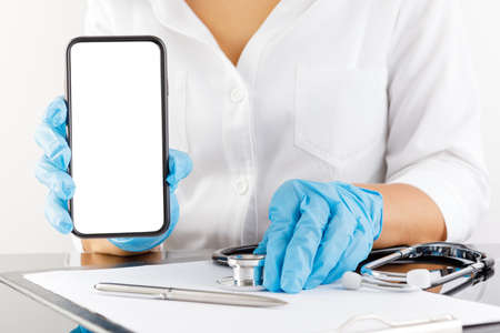Close up doctor hand in medical gloves showing a blank smart phone screen app. Mock up. Copy space for your text.