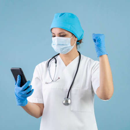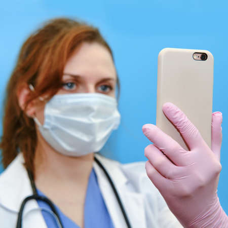 Doctor with a phone in her hand, blue background. Concept of remote care for patients with coronavirus, helps patients through the Internet. Stay at home.