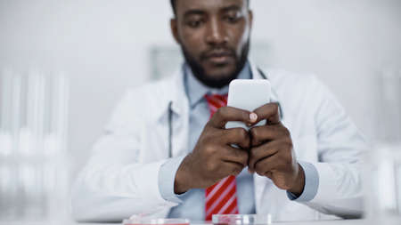 blurred african american doctor messaging on smartphone