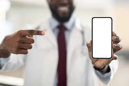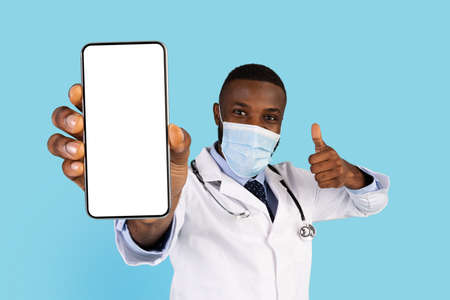 Black Doctor In Medical Face Mask Demonstrating Blank Smartphone Screen At Camera