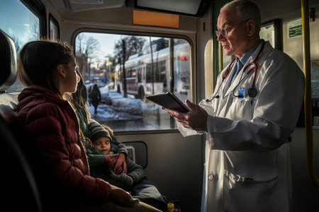 A dedicated physician conducts an examination of a young girl inside an ambulance while her sibling rests nearby, with city traffic visible outside.