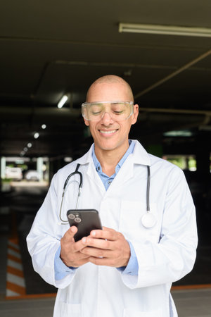 Mature male scientist with protective eyewear and lab coat standing outdoors near building. Confident and modern science concept.
