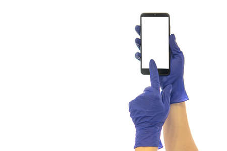 hands in medical gloves holds phone. isolated on white. high quality