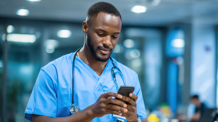 Focused healthcare professional in blue scrubs using smartphone to communicate and access information in a modern medical facility environment