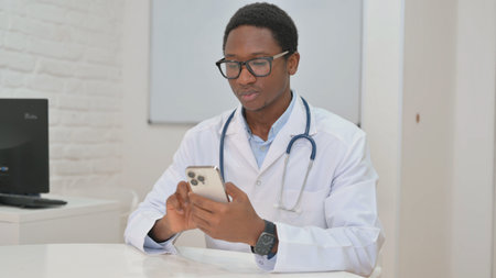 Young African Doctor Typing Message on Phone in Clinic
