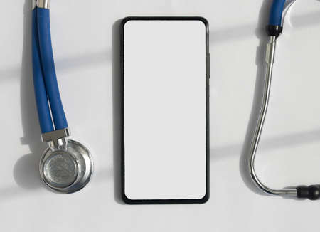 Mobile phone mockup with stethoscope over white desk, top view. Template with white screen of smartphone for medical app.