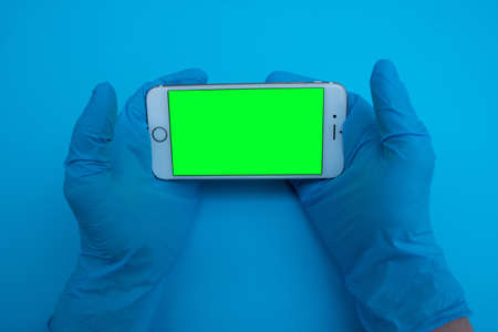Smartphoe with green screen in blue glove of hand scientist.