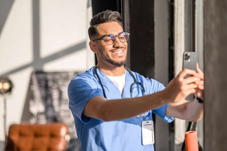 Physician with a radiant smile taking photos of himself