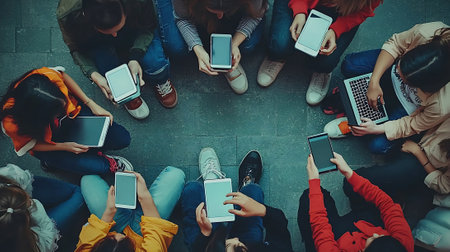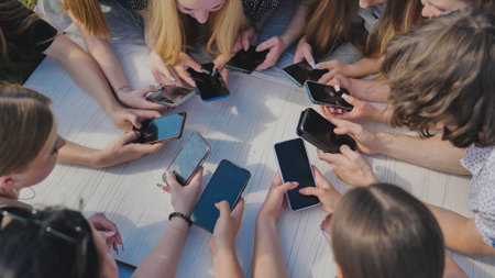 Generative AI : Close up of group of young people with smartphones in the hands Young people addiction to new technology trends