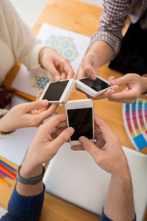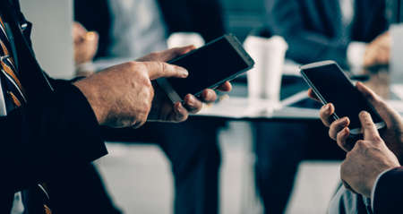 Innovative technologies. Close up of modern people holding mobile phones in their hands and using it