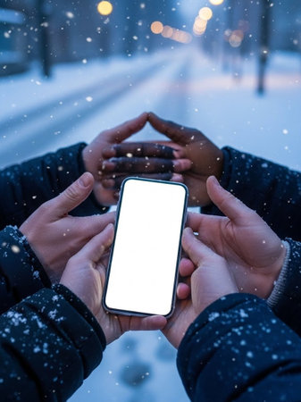 Mockup image of hands holding a smartphone with a white screen on a snowy winter street