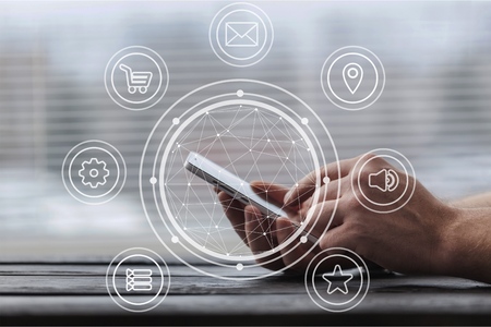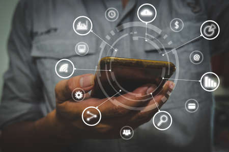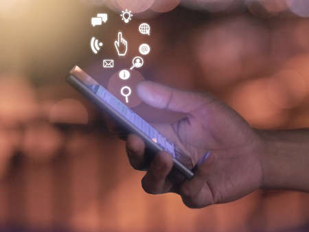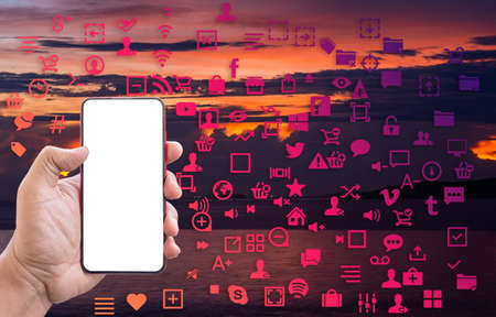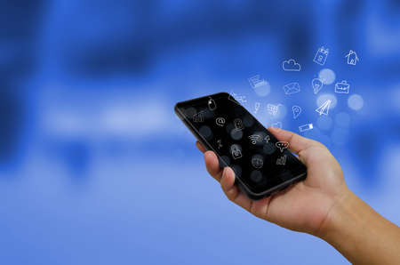 Business hand using smartphone with icons concept. Hand use smartphone online shopping Social network concept.Digital marketing media network Communications, E-Commerce business.