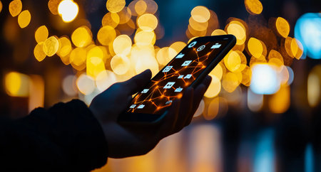 A hand holding mobile phone displaying social media icons against blurred background of warm lights. image captures essence of digital connectivity and modern communication