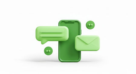 A modern green smartphone is surrounded by floating 3D icons representing chat bubbles and an email envelope, symbolizing communication.