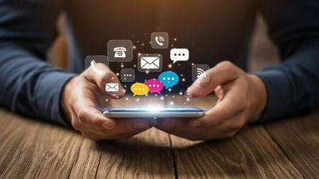 A smartphone is placed on a vibrant yellow surface with various notification icons scattered around it, representing user interactions.