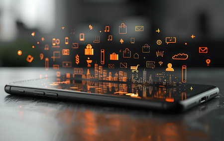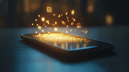 A smartphone radiates vibrant digital icons and sparkles in a dark setting, symbolizing modern technology's influence on our daily lives and digital experiences.