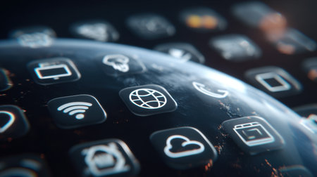 This image showcases an abstract digital globe encircled by vibrant app icons, symbolizing modern technology and global connectivity in a sleek design.