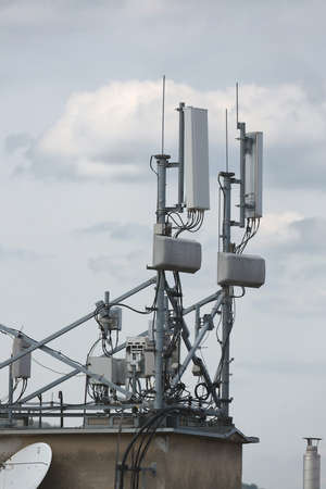 Cell site base station. Telecommunication tower. Wireless communication antenna transmitter.Digital wireless connection system.