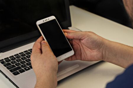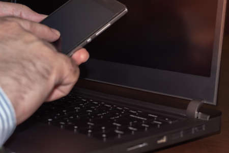 hands of a man handling a cell phone attached to a laptop with a white screen on a wooden desk with blue lighting, laptop mock up and smart phone