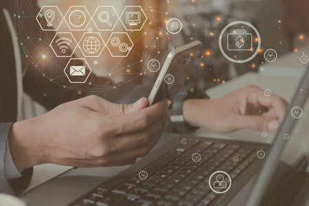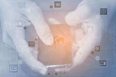 businessman hand pick mobile smartphone device with internet market social network concept, data machine deep learning, cloud storage server online, technology digital privacy, system of cyber connecting