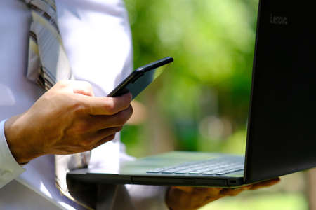 Photo closeup of businessman sitting on city street with offline smartphone and digital laptop and typing on keyboard. Modern lifestyle, outdoor workplace, device. Technology and people concept