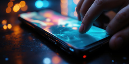 Hand holding illuminated smart phone, close up of touch screen technology generated by artificial intelligence