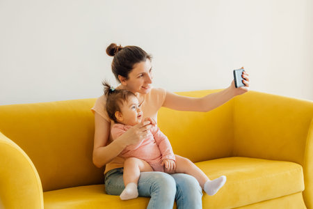 Portrait of happy positive optimistic female sitting with her infant daughter in arms on comfortable sofa and taking selfie or having video call, expressing positive emotions.