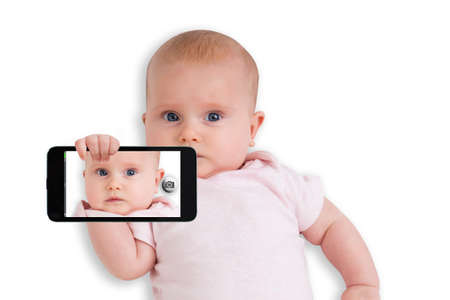 A Cute Baby Taking Selfie With A Mobile Phone Over White Background