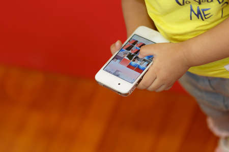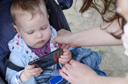 Baby toddler holding smartphone. Watching a video on smartphone.