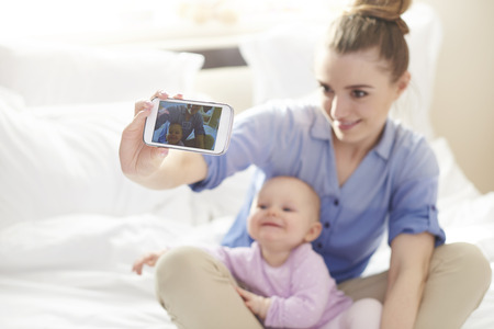 Funny baby girl make selfie on mobile phone and lying near her mother.