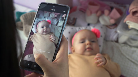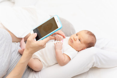 Mother holding smartphone and taking a photo of a newborn baby lying on their lap