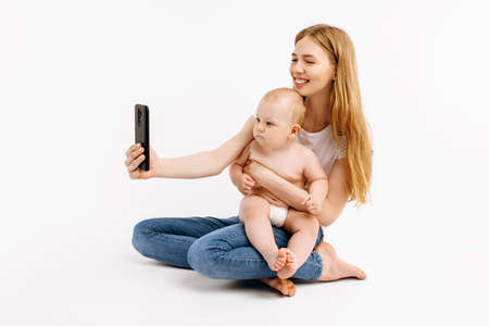 smartphone selfie family newborn mother concept. photo memory. happy motherhood.