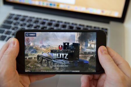 Moscow / Russia - February 20, 2019: holding an iPhone on MacBook background. World of tanks game is loading