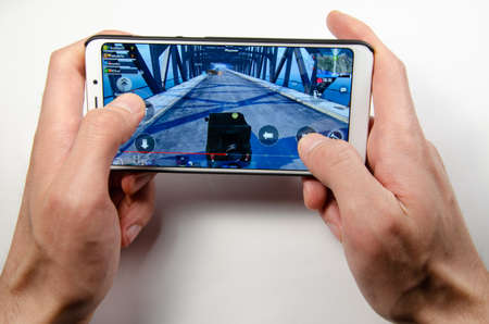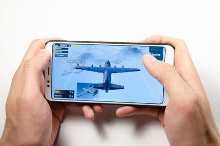April, 2019. Kramatorsk, Ukraine. The gameplay of the game PUBG G Mobile on a white smartphone in hand