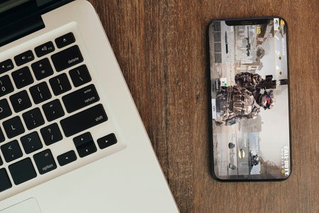 Call of Duty mobile game app on the smartphone screen on wooden background with a computer beside it. Top view. Rio de Janeiro, RJ, Brazil. May 2021.