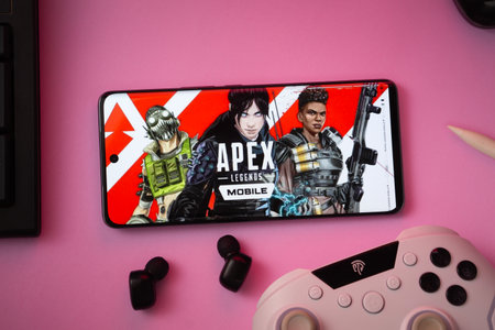 Dhaka, Bangladesh- 19 Sep 2025: A close-up of a white gamepad with the Apex Legends mobile seen on screen in the background.