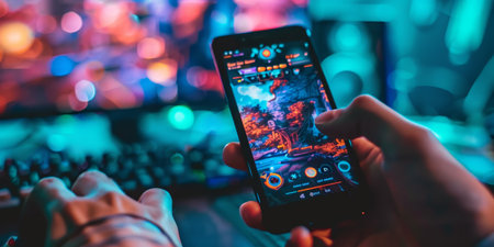 Mobile game in phone or live streaming video about fps gaming or esport. Gamer playing first person shooter online with smartphone. Man watching stream. Fun hobby and digital entertainment concept.