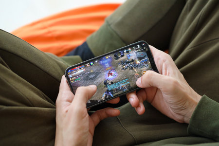 Bucharest, ROMANIA - May 10, 2021: Illustrative editorial concept image of a child playing Battlefields game on a mobile phone.