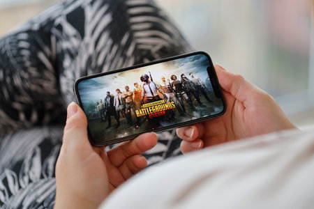 Los Angeles, California, USA - 17 December 2018: Hands holding a smartphone with PUBG FPS game