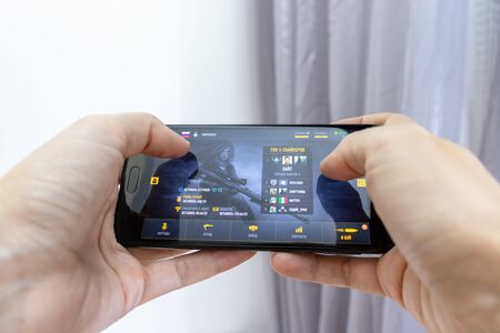 MOSCOW, RUSSIA - JANUARY 08, 2018: Hands holding a smartphone with online multyplayer shooter game Sniper Arena. Mobile gaming and entertainment.